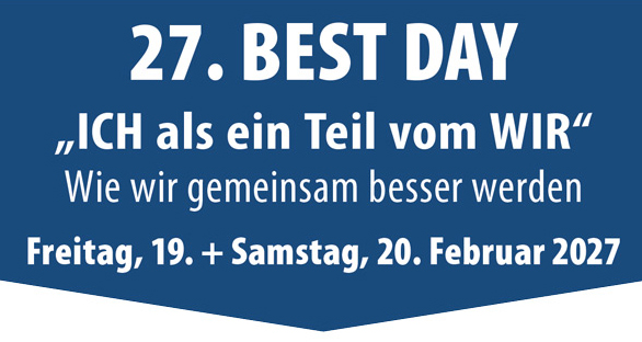 Der 26. Best Day am 20. & 21. Februar 2026 im Maritim Hotel Düsseldorf bietet „Flexibel und anpassungsfähig in Zeiten des schnellen Wandels". Eine erstklassige Fortbildung mit spannenden Voträgen namhafter Referenten. Jetzt Tickets sichern!